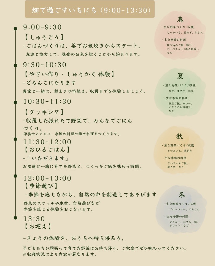 種まきや水やり、草取りなどの収穫体験を中心に行なっていきます。また、簡単な調理体験なども行います。